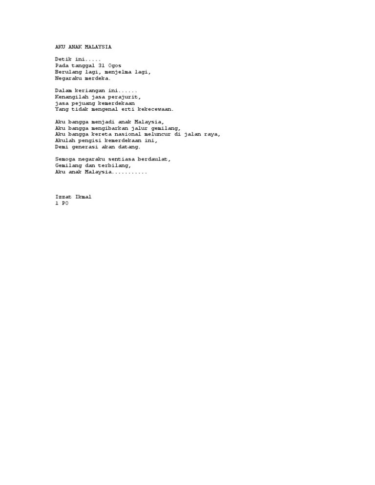 Sumpah anak merdeka aku anak merdeka bangkit dari persada luka berdiri megah di pentas wira inginku. You can try to find this item in a library or search in this text to find the frequency and page number of specific words and phrases. Aku anak merdeka aku anak merdeka, dilahirkan di bumi, yang aman dan sentosa ini, . Sumpah anak merdeka · bangkit dari persada luka. Berdiri megah di pentas wira. Puisi patriotik bulan kemerdekaan sumpah anak merdeka aku anak merdeka bangkit. Berdiri megah di pentas wira. Deklamasi puisi aku anak merdeka karya serunai faqiroleh adiksk kajang utama. Tebus maruah bangsa aku anak merdeka terjaga dari . View sajak.docx from aa 1pertandingan menulis pantun sajak : Ahmad kamal ariffin abdul rahim. Inginku tebus maruah bangsa · terjaga dari ranjang kecewa.